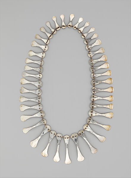 Known primarily for his sculptures, Calder first began to produce jewelry in 1929 while in Berlin. Hammering wires and small pieces of metal into flattened shapes, he created necklaces, earrings, bracelets, brooches, cufflinks, and belt-buckles, among other items. Calder drew inspiration for many of his jewelry pieces from African designs, Nootka and Navajo ornaments, Amazonian feathered adornments, Brazilian luck charms, and Inca quipus, or knotted threads. While the specific referent for this necklace is unknown, its forms resemble bones or feathers and recall non-Western prototypes.