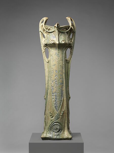 This vase is an extraordinary feat of Art Nouveau ceramics by the French architect Hector Guimard, who designed the iconic Paris Métro entrances. Monumental in scale, the Vase des Binelles has an architectural presence and a strong organic form, and its curvilinear handles are evocative of the ornate cast-iron elements of Guimard's buildings. The specialized crystalline glaze, developed at the end of the nineteenth century, features iridescent crystal particles that create a sparkling effect. Only five examples of this model were made.