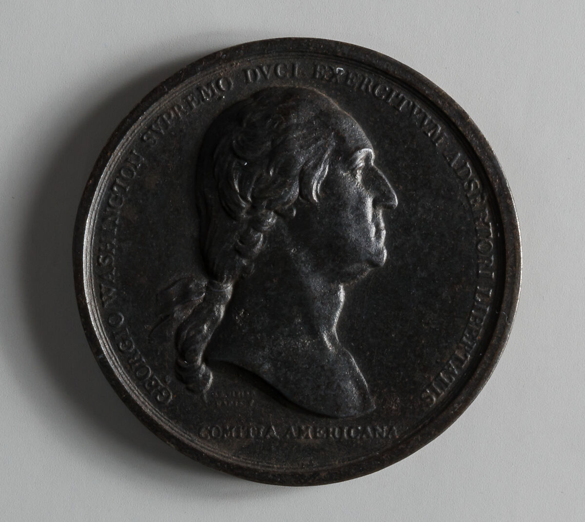 Duvivier was a prolific medalist who had a lifelong royal court appointment to the French crown (he was a favorite of Louis XVI) and the Institut de France. He was commissioned by Colonel David Humphreys, John Adams, and Thomas Jefferson to create this medal. It was the first of the Comitia Americana series: a collection of medals that accompanied Congress’s resolutions of thanks for military accomplishments in the American Revolution. Created for George Washington to recognize his victory in compelling British troops out of Boston on March 17, 1776, the obverse of the medal shows a profile bust of Washington (allegedly based on Jean Antoine Houdon’s model), while the reverse depicts the general on a horse, pointing towards the British troops sailing out of the harbor. Like the other medals in the series, it was designed and struck at the Paris Mint; however, it took fourteen years to be produced and sent to Washington, on account of several failed committees and a rejected design.