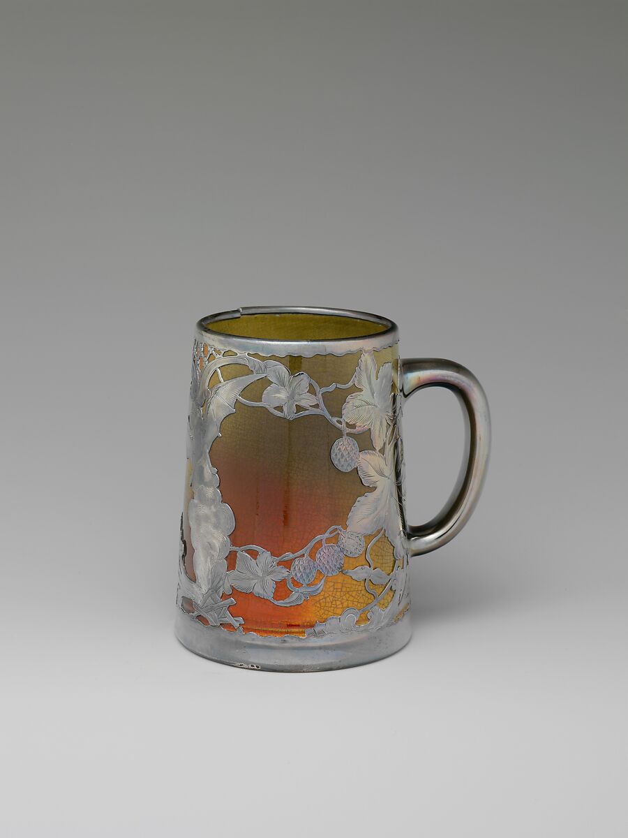 Beginning in 1892 Rookwood collaborated with the Gorham Manufacturing Company in Providence, Rhode Island to have silver overlay designs placed on its Standard glaze pottery. Between September, 1892, and July, 1893, Gorham embellished 918 objects. Rookwood had no control over the silver designs, and as this mug exemplifies, the floral design of the silver bears little relation to the painted decoration of witch, flying bat and burning fire. The American Wing has another example of this technique, see 1974.214.28. For other examples of Rookwood Pottery, see 43.67, 45.147, 69.17, 69.37.1, 69.37.3, 1973.93, 1974.214.28, 1980.452, 1980.453, 1981.443, L.1999.101 1991.214, and 1991.335.