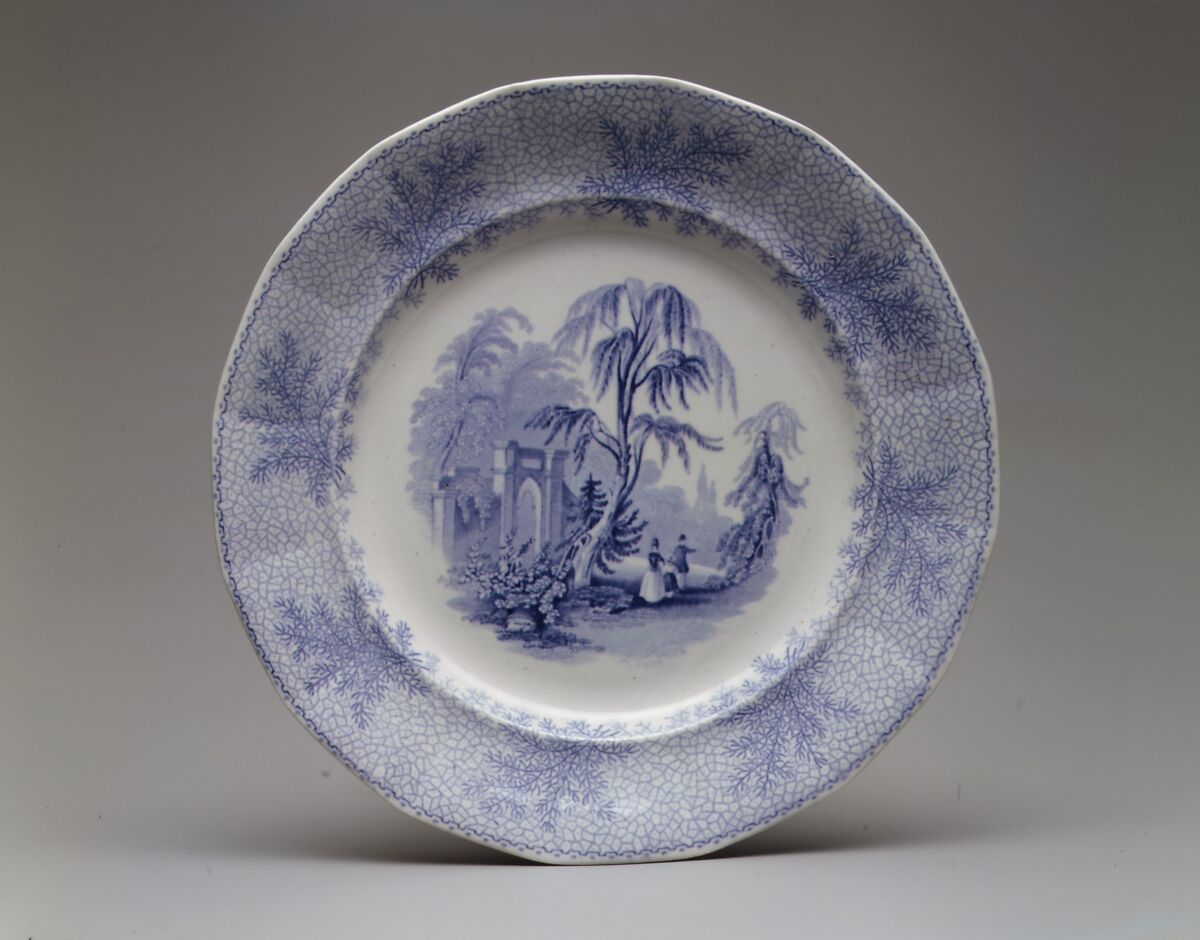 This blue and white transfer-printed earthenware plate made by the Staffordshire firm of William Ridgway & Co. features a view of the tomb of George Washington (1732–1799), American Revolutionary hero and first President of the United States. The tomb is located at Mount Vernon, the Washington family estate on the Potomac River in Virginia. Mount Vernon was built in 1743 by Washington's elder half brother, Lawrence (1718–1752), and was named after a family friend, Admiral Edward Vernon (1684–1757) of the English navy. Washington acquired the estate upon his brother's death in 1752. When Washington himself died, he was buried on the property where the tomb was erected in his memory. Ridgway's view of the tomb was based on a drawing by English artist William Henry Bartlett (1809–1852) engraved by English engraver John Cousen (1804–1880) and reproduced as "The Tomb of Washington, Mount Vernon" in Nathaniel Parker Willis' "American Scenery" (London, 1840). Ridgway included the view in its "American Scenery" series of approximately sixteen views manufactured for the United States export market. The American Wing's collection contains additional pieces from the series, as well as original works by Bartlett. The Museum also has various editions of "American Scenery." Refer to the Dictionary for a definition of the term "transfer printing" and for information about Ridgway.