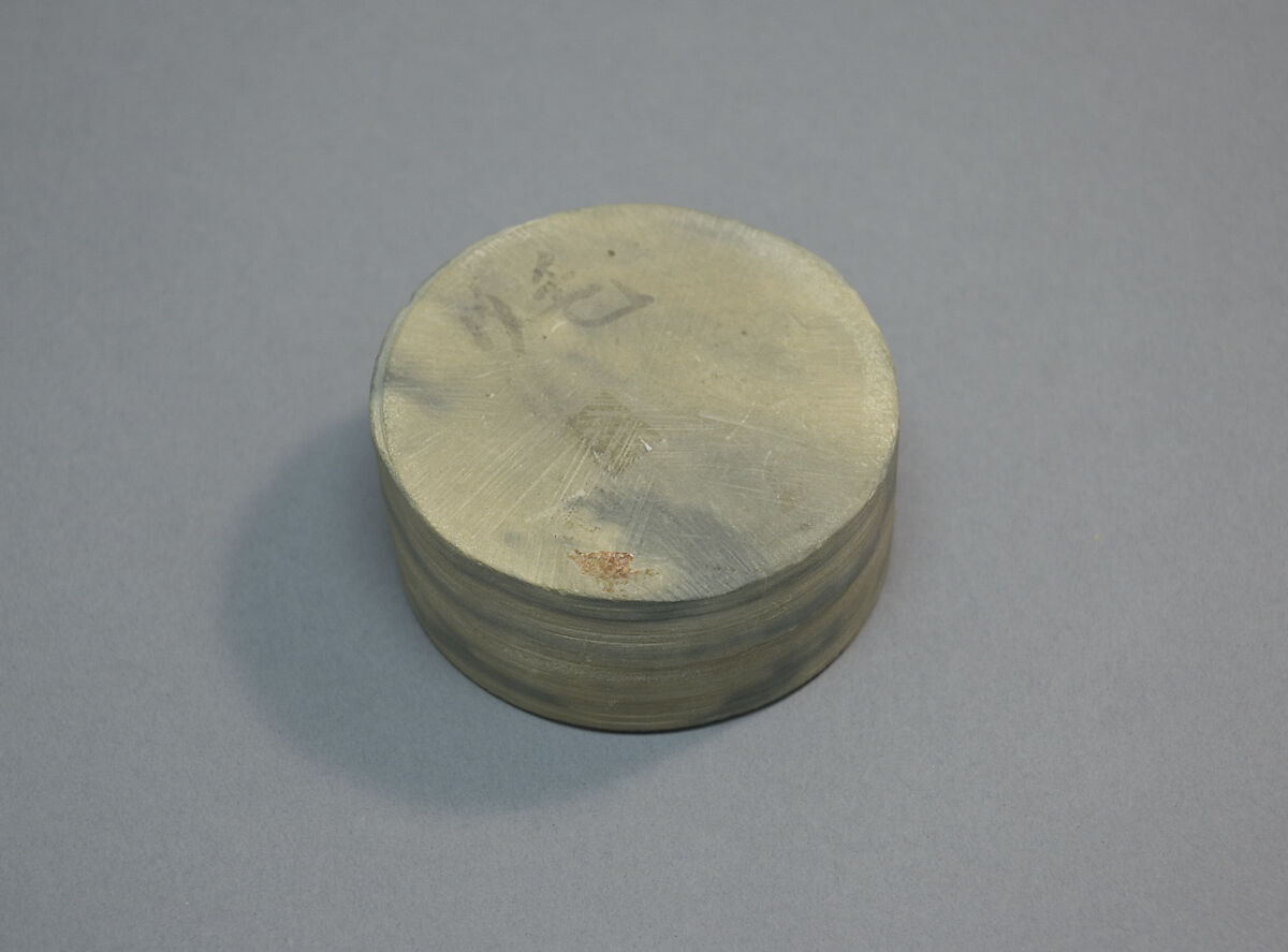 These wheels are made of soft materials and are used for polishing works of jade. They are first smeared with a paste made of fine abrasives and water, and then mounted on a spinning shaft driven by foot treadles. This setup frees both of the craftsman’s hands to manipulate the jade.
