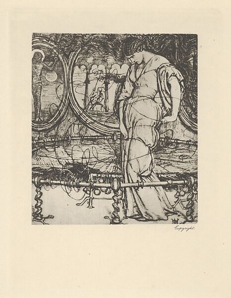 This print is based on a photograph of the drawing Hunt made on the woodblock, later cut to produce a wood engraving for Tennyson's Poems, published London by Moxon 1857. The drawing was necessarily destroyed when the block was cut and this illustration created for a 1903 New York edition of the Poems.