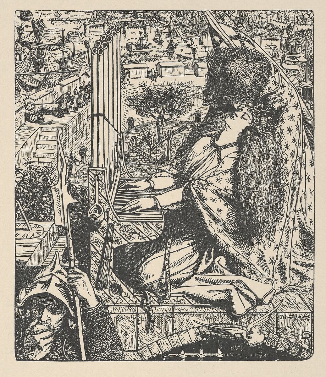 Rossetti’s 1857 illustrations of Tennyson—here reissued in 1903—incorporate startling effects derived from medieval and early Renaissance art. Space collapses, forms are cut off, and narrative details are inserted without concern for conventional perspective. Rossetti criticized the engravers and insisted on many changes, delaying the publication.