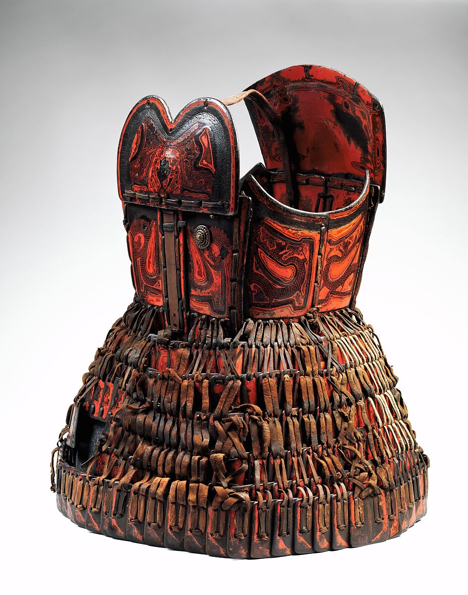 This armor is one of only two early examples of this type known to exist. Its distinctive form and construction are unique to Yunnan province in southwestern China. It is made of rigid leather panels coated with layers of red and black lacquer and joined together by leather laces. The layered lacquer technique, tixi (marbled) or ticai (carved colors), was well known in China from the fourteenth or fifteenth century onward. Scientific testing establishes the armor’s date to the time of the Dali Kingdom, an independent state that ruled the region before it was renamed Yunnan and incorporated into China during the Yuan dynasty (1271–1368). The armor, therefore, is extremely important as one of the earliest and most complete examples of this technique and for being identifiable as lacquerwork from the Dali Kingdom or the Yunnan area.