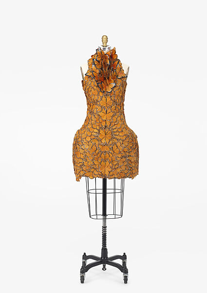 After fourteen years assisting Alexander McQueen, Sarah Burton was promoted to creative director in 2010 following her mentor’s tragic death. Burton’s first collection, exploring themes of nature, paganism, and English folklore, proved her ability to perpetuate the tradition of craftsmanship and creativity that has defined the house since its founding. With an embellished carapace of artificial butterflies, this hourglass-shaped dress relies on minimal seaming and is wholly free of boning or internal support. The hundreds of trompe l’oeil wings that veneer the textile ground are composed of meticulously cut, dyed, and painted feathers, applied by hand to emulate the distinctive pattern of the monarch butterfly. The colorful insect, a perennial motif of the house, conjures the promise of transformative renewal.