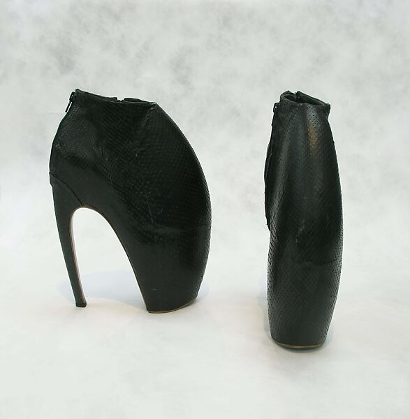 For his 2010 show titled “Plato’s Atlantis,” Alexander McQueen imagined a world in which the seas had risen and humankind was evolving to survive underwater. The collection features fantastical designs that suggest the morphing of our bodies into human-animal hybrids. These signature boots represent a hooflike extension of the wearer’s body and also evoke the graceful arch of a ballerina standing en pointe. Not intended to be commercially produced, the boots were nevertheless designed and crafted with precision. The hand-carved wood platforms provide a base for the ball of the foot, and an additional wooden support built out above the toe facilitates the lifting of the heavy footwear while walking.