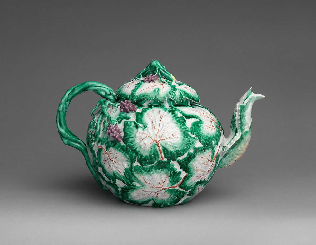 This punch pot was intended for the serving of an alcoholic punch, and its contents are suggested by the overlapping vine leaves and small bunches of grapes that decorate its surface. The pot was made at the Longton Hall factory in Staffordshire which frequently employed low-relief motifs drawn from nature as the primary decoration of its wares.