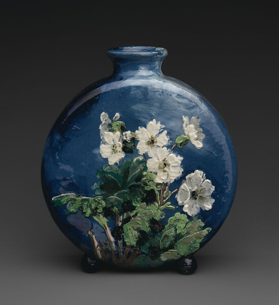 Louise McLaughlin was a pioneering figure in the history of American ceramics. Like many women of her time, she began her artistic career as a china painter. One of her earliest innovations was her discover of the barbotine technique in the late 1870s and early 1880s.This vase exemplifies McLaughlin’s work in that mode. It depicts in colored slips, the naturalistic floral composition of white primroses and foliage, in often heavy impasto, surrounded by green foliage, all on a deep blue mottled slip-decorated ground.