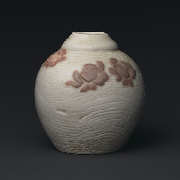 Louise McLaughlin was a pioneering figure in the history of American ceramics. Like many women of her time, she began her artistic career as a china painter. One of her earliest innovations was her discover of the barbotine technique in the late 1870s and early 1880s. One of her most challenging endeavors was her decision to work in artistic porcelain, a medium that had traditionally been confined to a large factory setting. McLaughlin began her experiments in porcelain in 1898 in a studio in her home, which she called “Losanti;” although a small enterprise, she hired assistants to slip-cast models she created, and then she carved or excised designs into the vases, glazed them, and had them fired in a kiln in her back yard in Cincinnati. McLaughlin and her colleagues in Cincinnati were especially influenced by the work of contemporary Scandinavian potteries, notably the Royal Copenhagen Porcelain Manufactory and Bing and Grøndahl firm in Denmark and the Rørstrand in Sweden. This small vase has tiny pink blossoms strewn over the surface, encircled by meandering lines in a manner that recalls Japanese textiles.