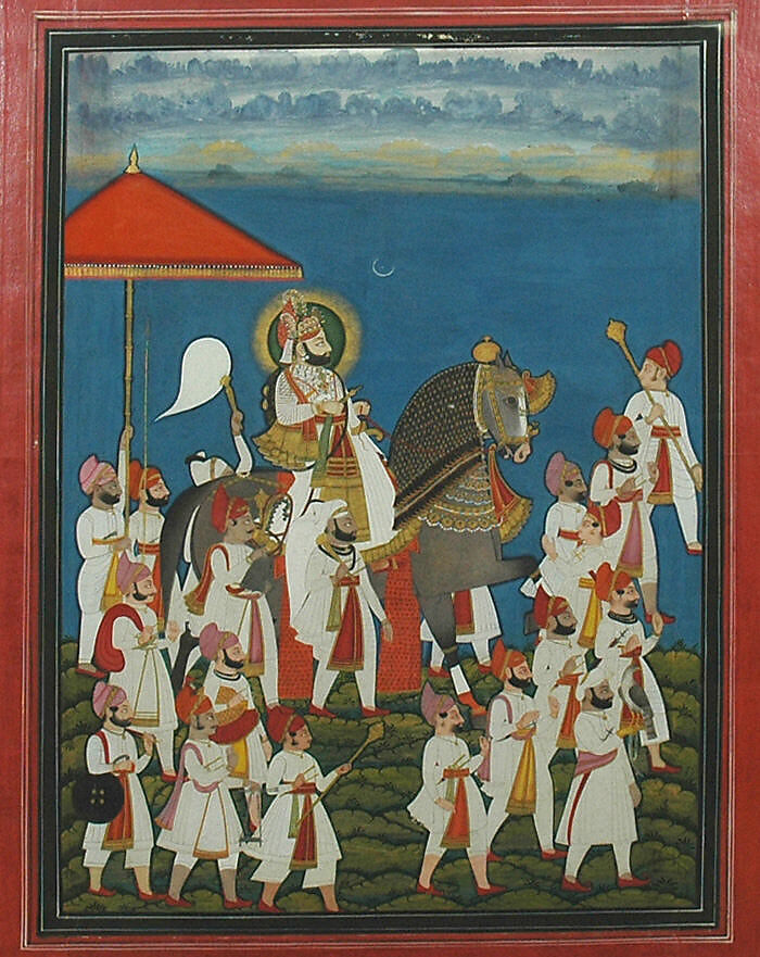 Maharana Bhim Singh is shown on horseback surrounded by retainers on foot. The artist Ghasi is first encountered as a draftsman for Colonel James Tod. After Chokha's death, about 1824, Ghasi became the principal artist at the Mewar court. The heavy outlining, glowing skin tones, and ornamental use of gold are typical of Ghasi's style.