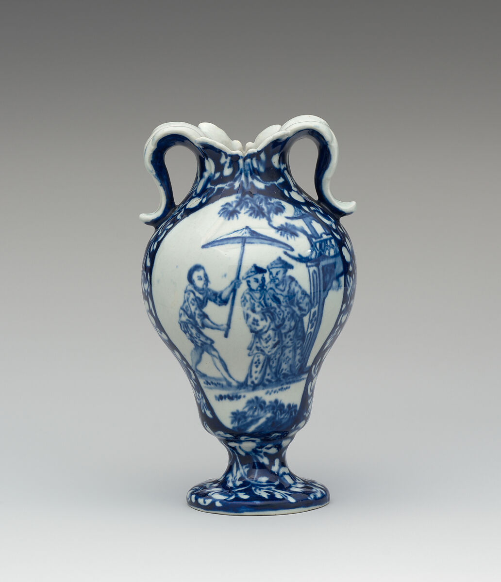 The demand for porcelain in England in the mid-eighteenth century encouraged the founding of numerous porcelain factories, though only some of these flourished. A small enterprise was established in the early 1750s in Vauxhall, just to the southwest of London. Although the factory survived only ten years or so, it produced both decorative objects and wares of good quality, many of which were decorated in cobalt blue, as on this vase. The distinctive form of the vase copies that of a model produced at the Sèvres factory in France, though the decoration of the Vauxhall example is entirely English in spirit.