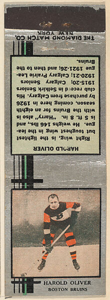 - Title: Harold Oliver, Boston Bruins, from Silver Hockey Players Match Cover design series (U9) issued by Diamond Match Company