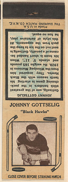 - Title: Johnny Gottselig, Black Hawks, from Yellow/Tan Hockey Players Match Cover design series (U10) issued by Diamond Match Company
