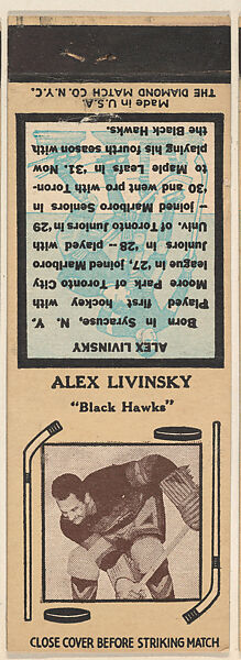 - Title: Alex Livinsky, Black Hawks, from Yellow/Tan Hockey Players Match Cover design series (U10) issued by Diamond Match Company