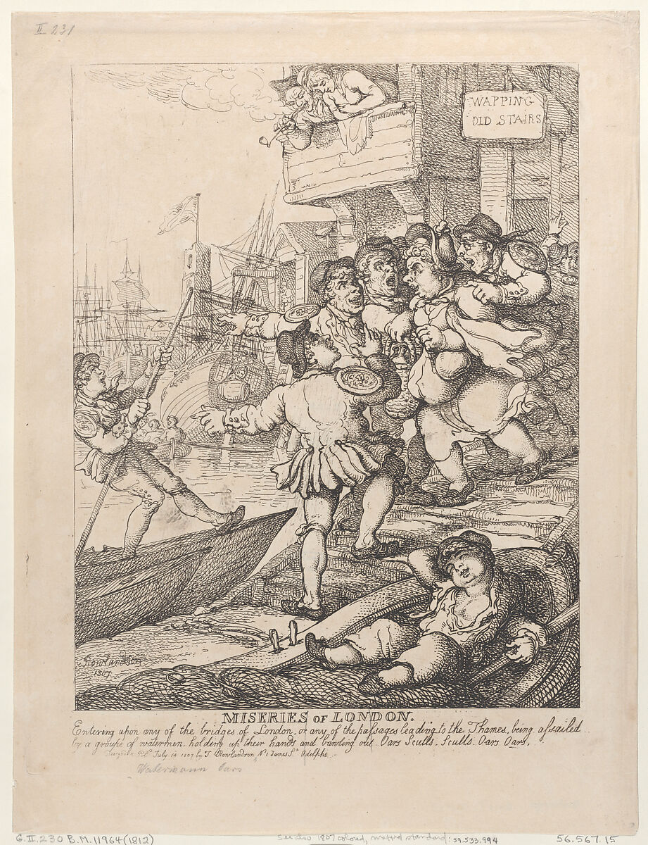 - Title: Miseries of London: Entering upon any of the bridges of London or any of the passages leading to the Thames being assailed by a group of watermen holding up their hands and bawling out. Oars Sculls. Sculls. Oars. Oars.