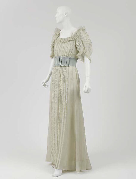 Beyond the archetype of the soft cardigan suit, Chanel in the 1930s created dresses of tiered and contrived lace akin to modern architecture. Inherently the lace and small ruffles seem insubstantial, but Chanel uses the pliant form as the inherent structure for a lightly fabricated dressmaking. Furrows of ruffles are both delicate and architectonic on this dress.