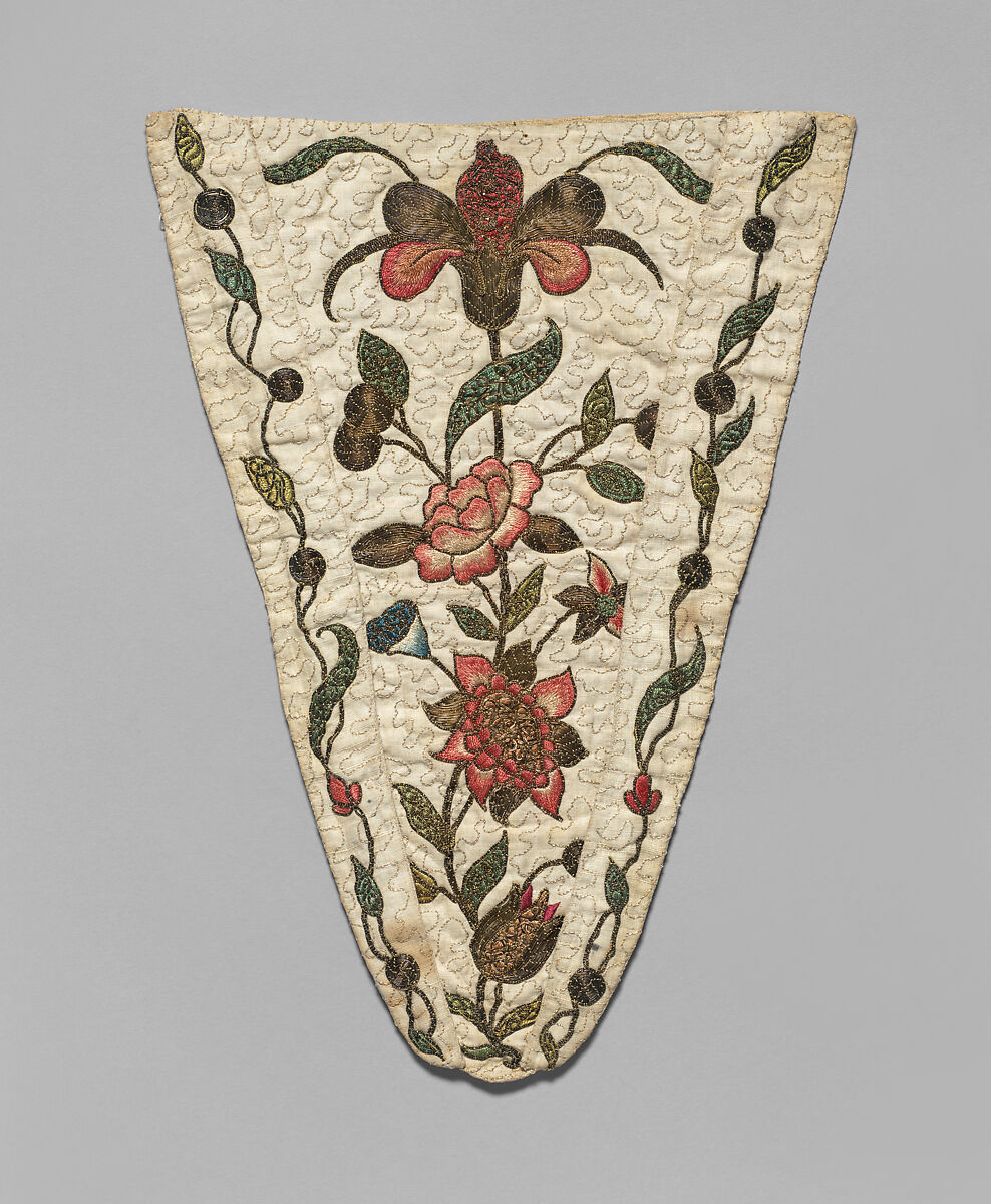 This triangle-shaped textile is an accessory to a garment: a stomacher, designed to be worn as a central bodice piece with open robes of the eighteenth century. Represented as if growing up the lady’s torso in one elegant vine, a tulip, rose, iris, and an unidentified dahlia-like flower display gloriously lush crimson petals ornamented with copious, cleverly manipulated gilded thread, stitched and looped. The same care has been taken representing a variety of different foliage, with a more minimal matching pair of vines defining the outer struts of the stomacher. Across a ground of simple white linen, the whole is given startlingly effective decorative treatment by the meandering vermiculation of precious metal thread. The cumulative effect of this fashionable accessory is simple (if affluent) elegance.
