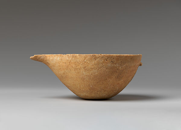 This delicate spouted hemispherical bowl with a horizontal lug handle is complete except for minor losses at the rim and spout. It is carved from very fine translucent marble. Its sides curve up and out from a small, flat base. A gently curved spout is carved at one end of the rim and the shallow horizontal lug is carved opposite it for a balanced pour. This bowl is a very fine marble example of the common Early Helladic and Early Cycladic clay sauceboat vessels used for pouring and/or drinking liquids.(1)