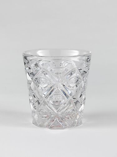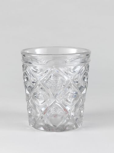 With the development of new formulas and techniques, glass-pressing technology had improved markedly by the late 1840s. By this time, pressed tablewares were being produced in large matching sets and innumerable forms. During the mid-1850s, colorless glass and simple geometric patterns dominated. Catering to the demand for moderately-priced dining wares, the glass industry in the United States expanded widely, and numerous factories supplied less expensive pressed glassware to the growing market. At the Exhibition of the Industry of All Nations at New York’s Crystal Palace in 1853, for example, the New England Glass Company exhibited 130 pieces of one design, "consisting of bowls, tumblers, champagnes, wines, and jelly glasses." This object belongs to one such service. Although the glass manufactory is not known, the glassware is very typical of the large services that were very popular with America’s middle class in the nineteenth century.