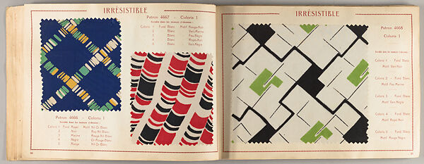 A trade catalog of textile samples manufactured in Lyon, France. In the silk capital of Europe, Lyonnais manufacturers produced brocades for Louis XIV and eventually attracted designers such as Sonia Delaunay and Raoul Dufy. Featuring over one hundred swatches, this unique item offers colorful patterned natural silk crêpes, muslins, and Hunan silks, as well as toiles, artificial crépons, imitation piqués, and synthetic georgette crêpes.