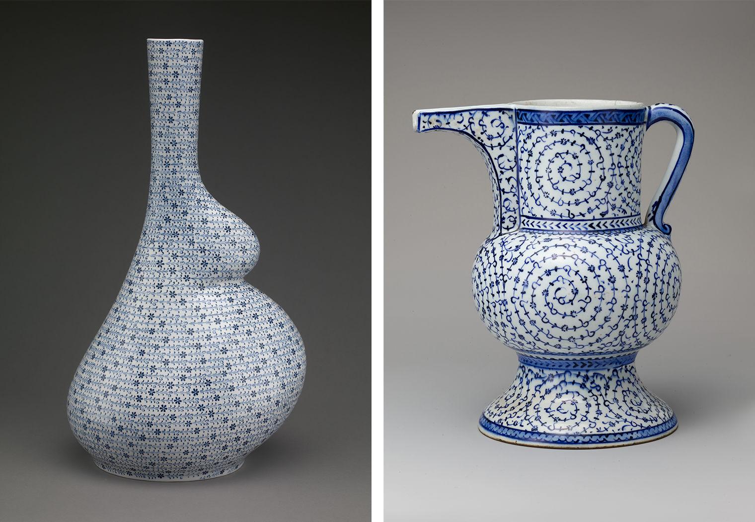 Left: Pregnant Haliç II by Elif Uras (Turkish, born 1972). Turkey, Iznik, 2015. Stonepaste; underglaze painted; Height 24 in. (61 cm), Width 10 1/2 in. (26.7 cm), Depth 12 1/2 in. (31.8 cm). Gift of Öner Kocabeyoğlu, 2016 (2016.76); Right: Ewer with 'Tughra-Illuminator' Style Decoration. Made in Turkey, Iznik, 1525–40. Stonepaste; painted in blue under transparent glaze; Pitcher: Height 8 13/16 in. (22.4 cm), Width 7 7/16 in. (18.9 cm), Max. diameter 5 1/2 in. (14 cm). Harris Brisbane Dick Fund, 1966 (66.4.3a, b)