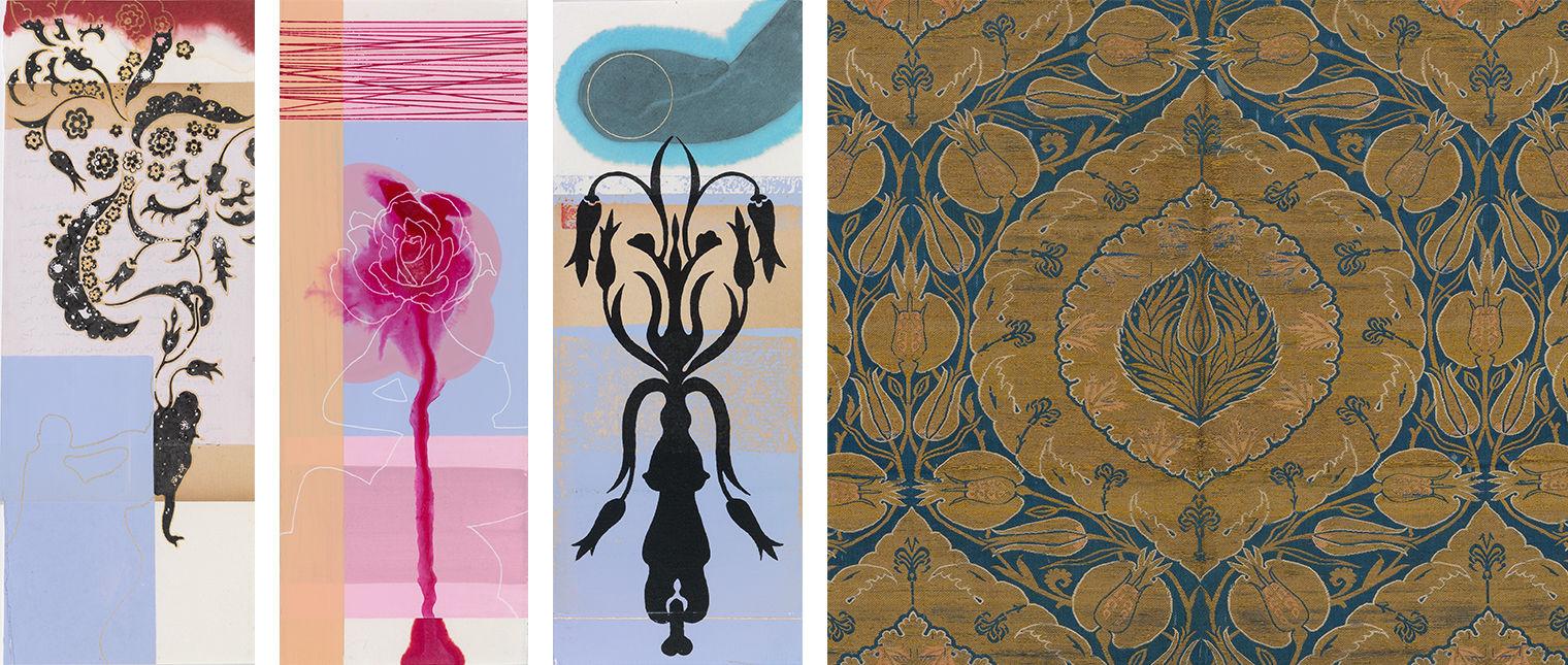 Left: Görgü Kuralları (Bahname) by Peter Hristoff (Bulgarian, born Turkey, 1958). United States, New York, 2007. Mixed media (ink, watercolor, vinyl, silkscreen) on paper; twenty-five folios in an embossed box; Box: Height 13 1/2 in. (34.3 cm.), Width 5 1/2 in. (14 cm.), Depth 2 3/4 in. (7 cm.). Gift of the artist, in honor of Nur and Selçuk Altun, 2014 (2014.12a–z); Right: Detail of Textile Fragment with Tulips and Pomegranates. Turkey, probably Istanbul, Ottoman period (1299–1923), mid-16th century. Silk, metal wrapped thread; lampas (kemha); Textile: Height 24 in (61 cm), Width 26 1/2 in (67.3 cm). Purchase, Joseph Pulitzer Bequest, 1952 (52.20.22)