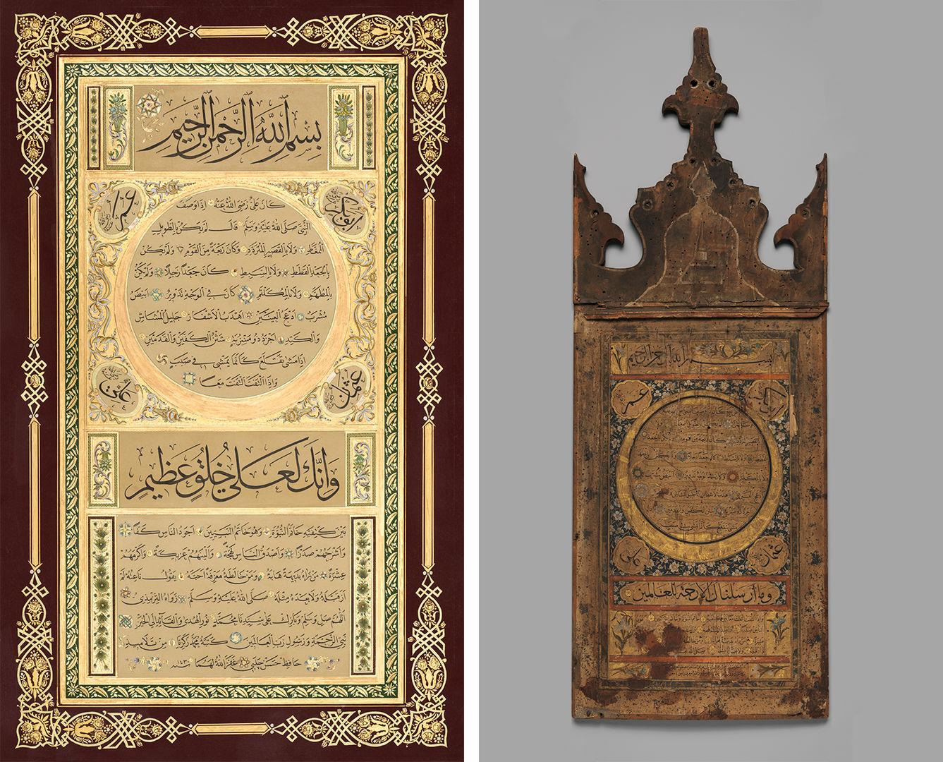 Left: Red Hilye by Mohamed Zakariya (American, born 1942). United States, 2010. Ink, hot tempera, and gold alloy on ahar paper; Height 29 in. (73.7 cm), Width 18 in. (45.7 cm). Louis E. and Theresa S. Seley Purchase Fund for Islamic Art, 2020 (2022.497); Right: Hilye (Votive Tablet). Attributed to Turkey, Istanbul, Ottoman period (1299–1923), 18th century. Ink, opaque watercolor, and gold on paper; wood; Height 27 7/8 in. (70.8 cm), Width 10 1/2 in. (26.7 cm). The Grinnell Collection, Bequest of William Milne Grinnell, 1920 (20.120.274)