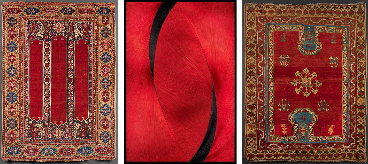 Left: Carpet with Double-Ended Triple Niche. Made in probably west-central Turkey, 18th century. Wool (warp, weft and pile); symmetrically knotted pile; Height 75 in. (190.5 cm), Width 54 in. (137.2 cm). The James F. Ballard Collection, Gift of James F. Ballard, 1922 (22.100.65); Center: Sharp Things by Gülay Semercioğlu (Turkish, born 1968). Turkey, Istanbul, 2013. Steel wire and screws on wood; Height 63 3/4 in. (162 cm), Width 44 1/16 in. (112 cm), Depth 2 1/8 in. (5.4 cm). Gift of Öner Kocabeyoğlu, 2014 (2014.132); Right: "Bellini" Carpet. Made in probably Western Turkey, 17th century. Wool (warp, weft and pile); symmetrically knotted pile; Height 69 in. (175.3 cm), Width 53 in. (134.6 cm). The James F. Ballard Collection, Gift of James F. Ballard, 1922 (22.100.89)