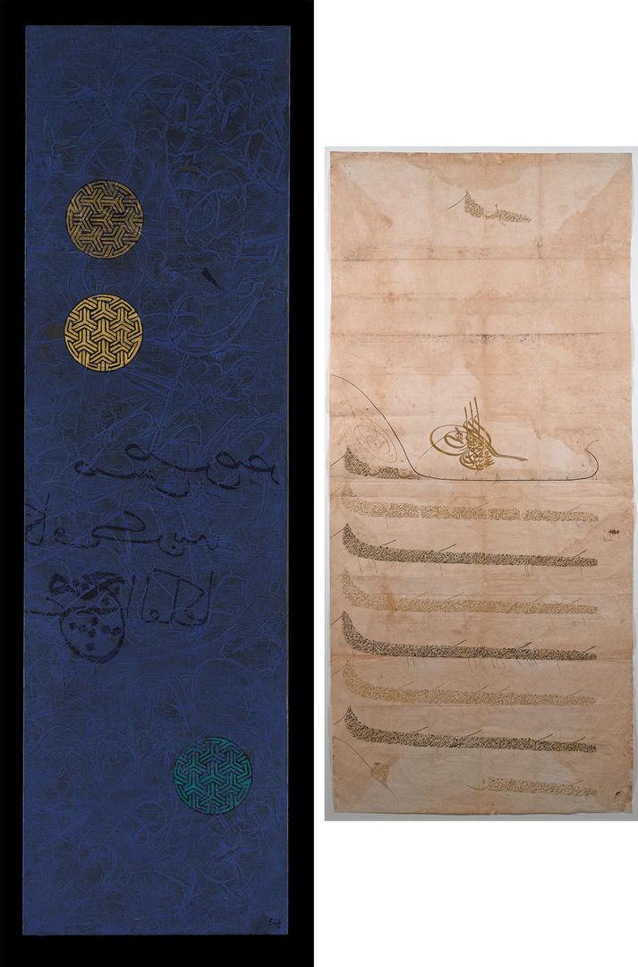 Left: Ferman by Erol Akyavaş (Turkish, 1932–1999). Turkey, 1992. Acrylic on canvas; Height 68 7/8 in. (174.9 cm), Width 19 3/4 in. (50.2 cm). Gift of Mrs. Ilona Akyavaş, 2017 (2017.236); Right: Firman (Official Decree) of Sultan Abdülmecid I (r. 1823–1861). From Turkey, Istanbul, dated January 1848. Ink, and gold on paper; backed onto cloth; With Frame: Height 66 in. (167.64 cm), Width 33 in. (83.82 cm). Private Collection of Seran and Ravi Trehan, New York. (Please note that this object is not part of the installation)