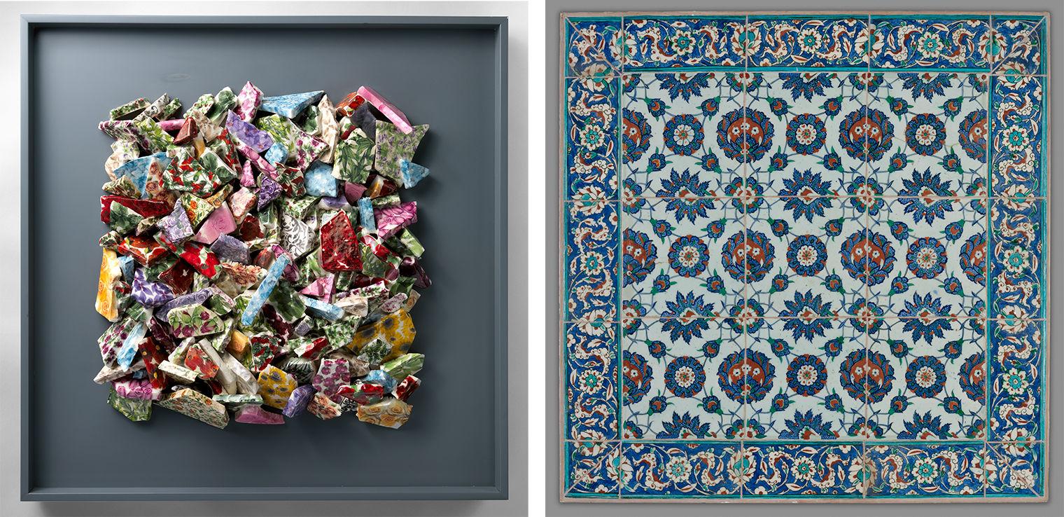Left: Broken II by Burçak Bingöl (Turkish, born 1976). Turkey, Istanbul, 2013. Stoneware, transfer-printed and glazed; glue, wood; Height 28 5/8 in. (72.7 cm), Width 28 3/4 in. (73 cm), Depth 3 1/2 in. (8.9 cm). Gift of Monika McLennan, 2016 (2016.304); Right: Tile Panel. Made in Turkey, Iznik, second half 16th century. Stonepaste; polychrome painted under a transparent glaze; Height 38 3/16 in. (97 cm), Width 38 1/2 in (97.8 cm), Depth 1 7/16 in. (3.7 cm). Gift of J. Pierpont Morgan, 1917 (17.190.2084)
