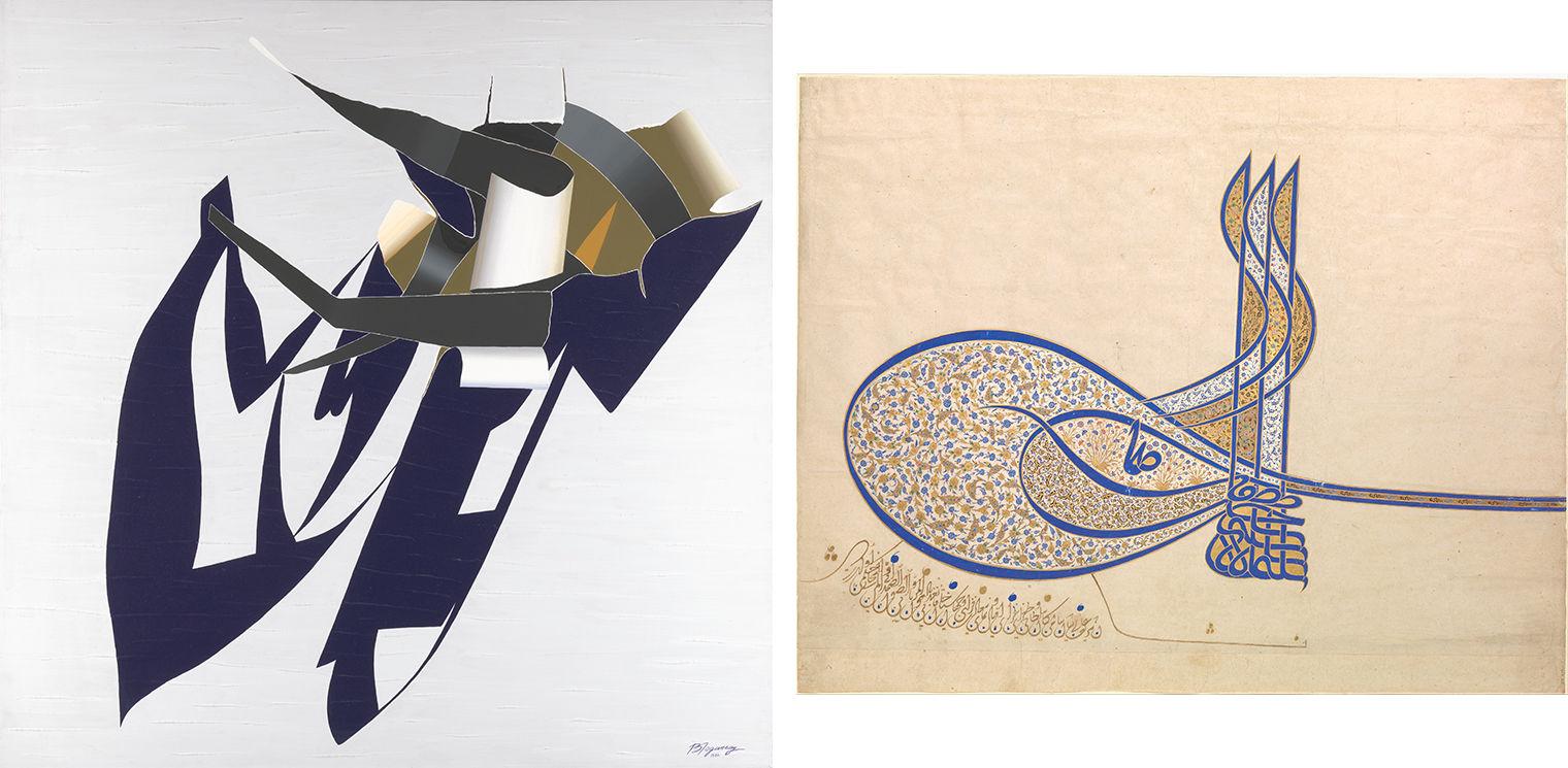 Left: Ribbon Mania by Burhan Doğançay, American, born Turkey, Istanbul (1929–2013). Made in Turkey, dated 1982. Acrylic on canvas; Height 60 in. (152.4 cm), Width 60 in. (152.4 cm), Depth 1 1/8 in. (2.9 cm). Gift of Benjamin Kaufmann, 2011 (2011.583); Right: Tughra (Insignia) of Sultan Süleyman the Magnificent (r. 1520–66). From Turkey, Istanbul, ca. 1555–60. Ink, opaque watercolor, and gold on paper; Mat: Height 25 in. (63.5 cm), Width 30 in. (76.2 cm). Rogers Fund, 1938 (38.149.1)