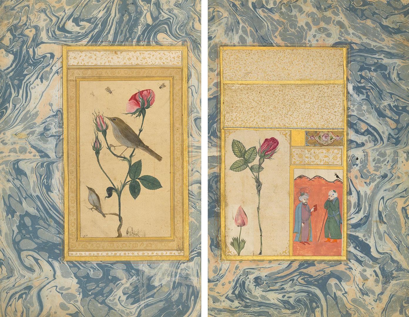 “Two Nightingales in a Rose Bush,” Double-Sided Illustrated Leaf from an Ottoman Album by 'Abdullah Bukhari (active ca. 1725–50s). Turkey, probably Istanbul, Ottoman period (1299–1923), ca. 1725–45. Opaque watercolor with black ink, shell, and gold leaf on paper, with a marbled paper margin; Folio: Height 16 5/16 in. (41.4 cm), Width 11 in. (27.9 cm). Purchase, Ravi and Seran Trehan Gift, in celebration of Turkey’s Centennial, 2023 (2023.217)