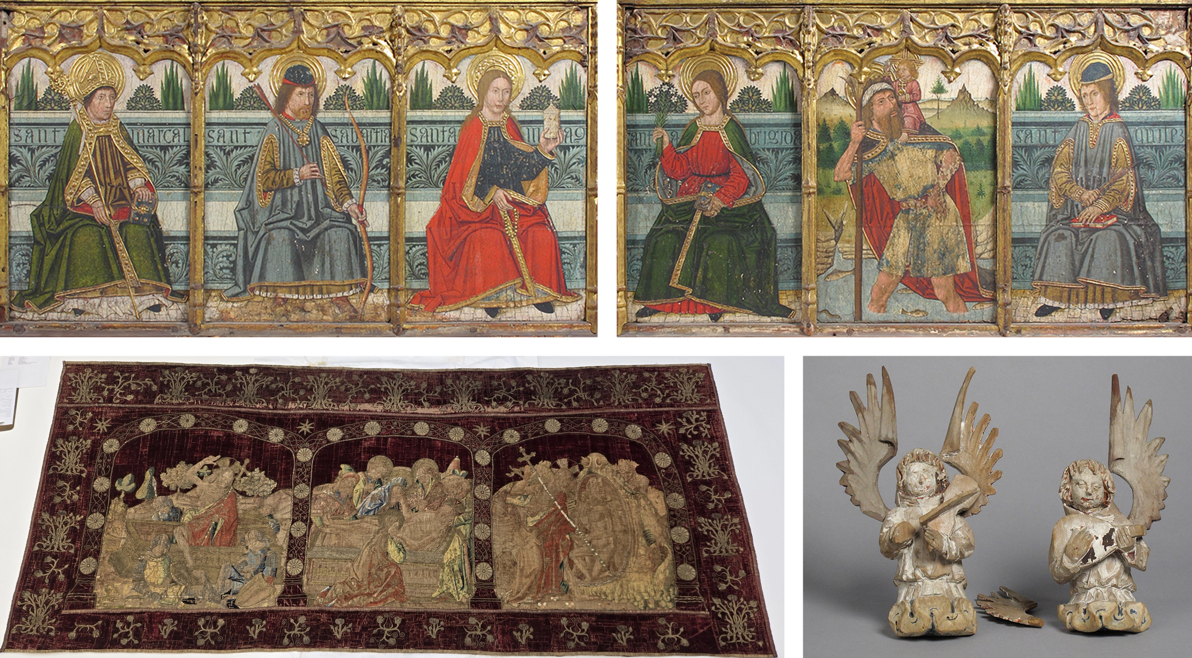 Clockwise from top left: Domingo Ram (Spanish, active 1464–1507). Predella panel with Saint Martial, Saint Sebastian, and Saint Mary Magdalen from Retable and Predella pane with Saint Bridget, Saint Christopher, and Saint Kilian from Retable, 15th century. Tempera on wood, gold ground, 24 1/2 x 41 1/2 in. The Metropolitan Museum of Art, New York, The Cloisters Collection, 1925 (25.120.674 and 25.120.673); Angel Playing Instrument, 15th century. French. Wood, paint. The Metropolitan Museum of Art, New York, The Cloisters Collection, 1925 (25.120.1055 and 25.120.1056); Textile, Altar Frontal, ca. 1500. French or Italian. Silk, metal thread, 48 1/2 x 108 in. (123.2 x 274.3 cm). The Metropolitan Museum of Art, New York, The Cloisters Collection, 1925 (25.120.422)