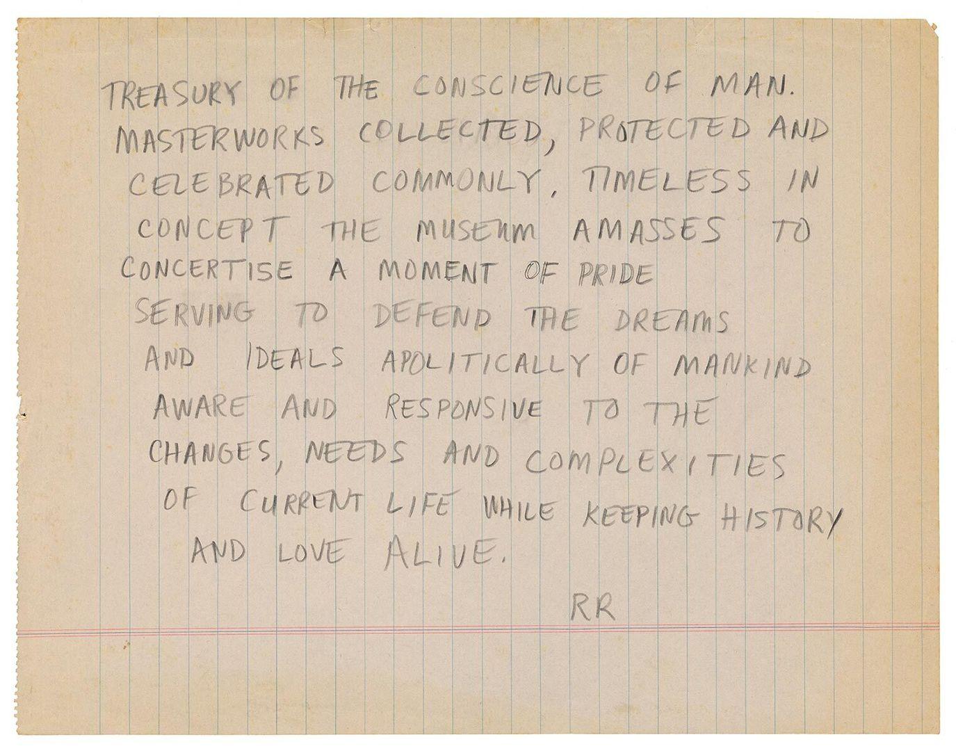 Robert Rauschenberg's handwritten draft of a statement on The Metropolitan Museum of Art, "Treasury of the conscience of man..." Robert Rauschenberg papers. Robert Rauschenberg Foundation Archives, New York. Creator: Robert Rauschenberg