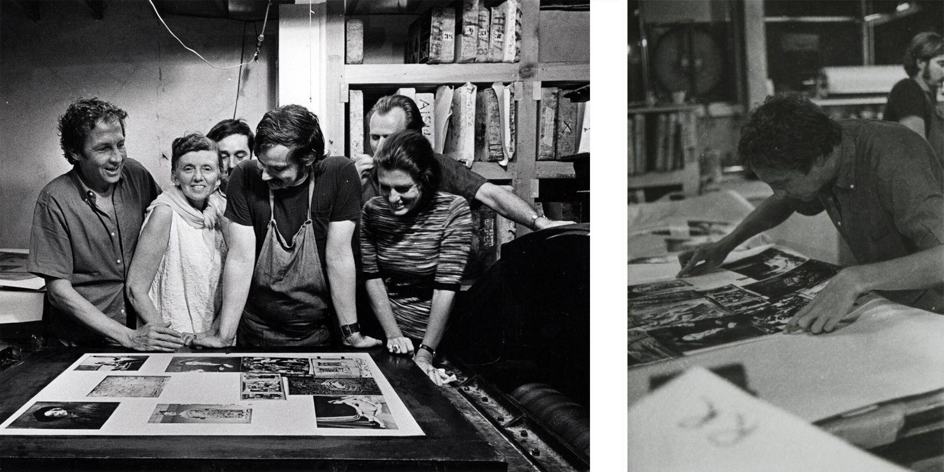 Left: (from left to right) Robert Rauschenberg, Tatyana Grosman, Bill Goldston, Frank Akers, Zigmunds Priede, and Marion Javitts observing the print Centennial Certificate MMA in 1969. Photograph by Hans Namuth © Hans Namuth Estate. Image courtesy United Limited Art Editions. Right: Robert Rauschenberg looking at a proof for his print Centennial Certificate MMA in 1969. ©Hans Namuth Estate. Image courtesy United Limited Art Editions