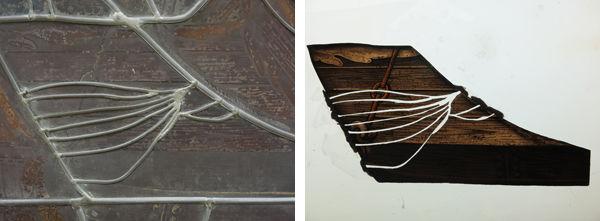 Left: Repair lead across the torso of a foreground figure, a location where Bousch made a deep, concave cut into the glass. Image courtesy of the authors
