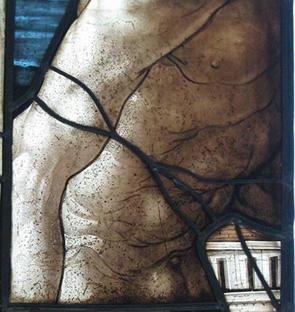 Removing the repair leads from this work was also important because of the artist's emphasis on reducing the overall appearance of lead lines in general. Bousch was an incredibly skilled glass cutter, able to craft irregular curves and deep indentations into a single piece of glass. This allowed him to strategically place lead so that the dark lines would recede, thus lending more focus to the painting.